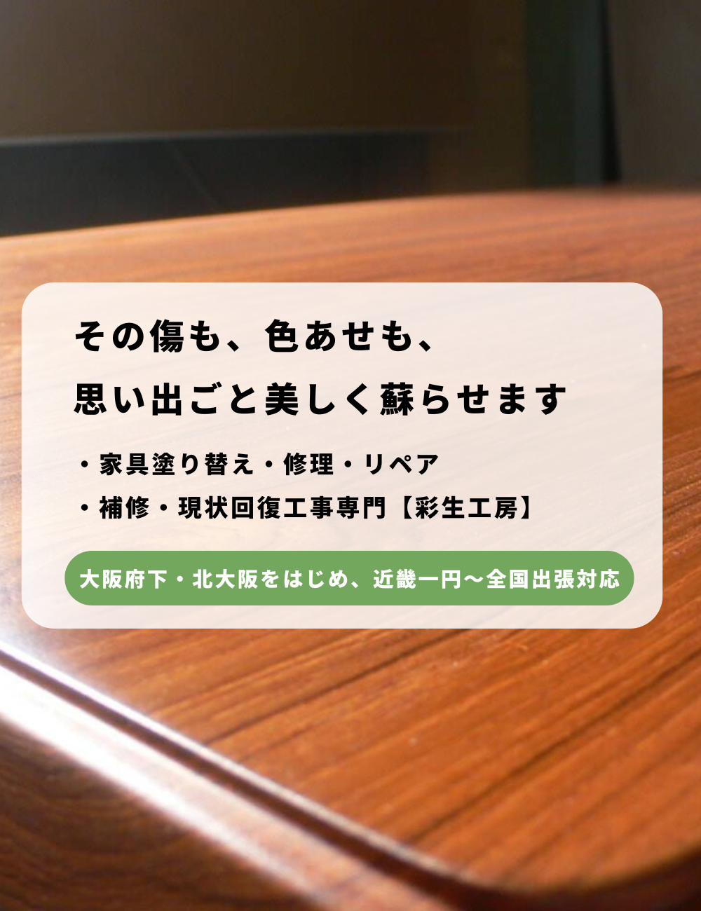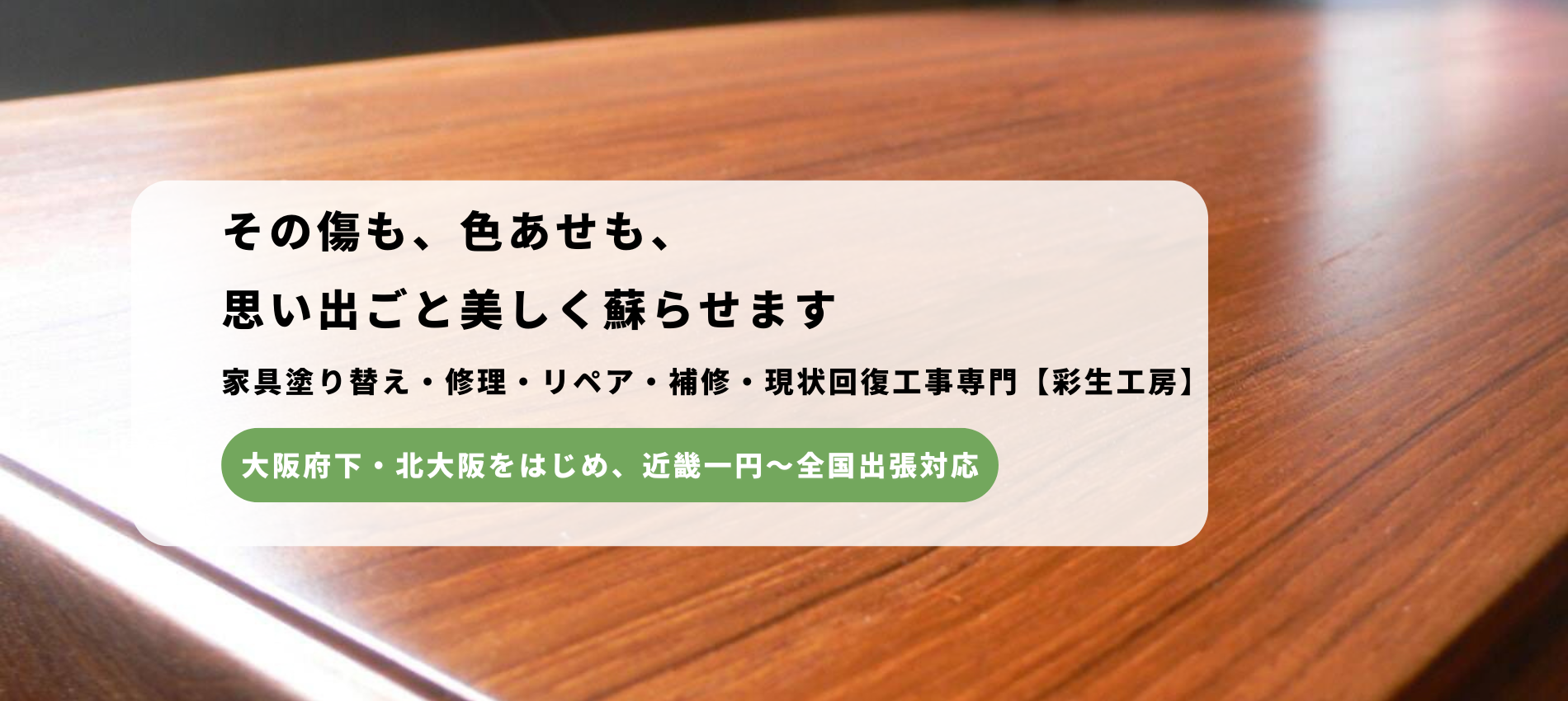 家具塗り替え・修理・リペア・補修・現状回復工事を専門に行う【彩生工房】です。大阪府下・北大阪エリアをはじめ、近畿一円〜全国まで幅広く対応しております。